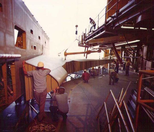 Tháng 5 năm 1982 là lúc lắp đặt cánh cho tàu Discovery. Trong bức hình chụp ngày 5/5/1982, các kỹ sư đang lắp đặt cánh bên trái cho tàu Discovery.