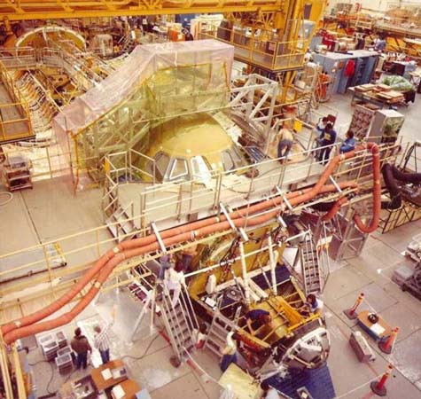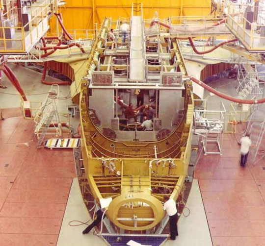 Trong bức ảnh này các kỹ sư của công ty Rockwell đang tiến hành kiểm tra xem các bộ phận trên và dưới của khoang trước tàu Discovery có vừa với nhau không. Ảnh chụp ngày 26/2/1982.