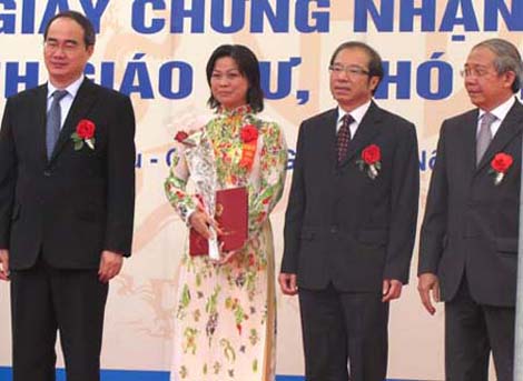 Phó Thủ tướng Nguyễn Thiện Nhân(chủ tịch Hội đồng chức danh Giáo sư Nhà nước) trao học hàm cho các giáo sư, phó giáo sư. Ảnh: Hoàng Thùy.