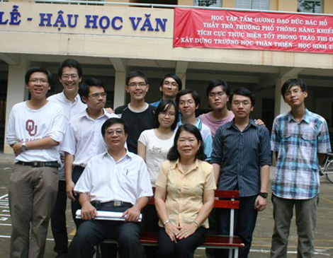 Hiệu trưởng trường Phổ thông Năng khiếu TPHCM Võ Thị Bạch Mai (hàng đầu bên trái) cùng học sinh đoạt thủ khoa - á khoa trong mùa tuyển sinh ĐH 2010 (Ảnh: Hoài Nam).
