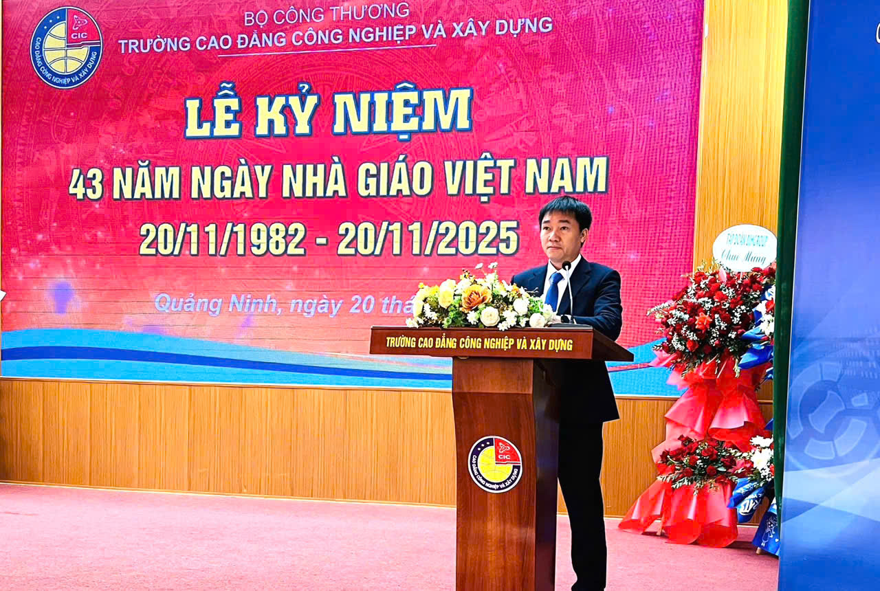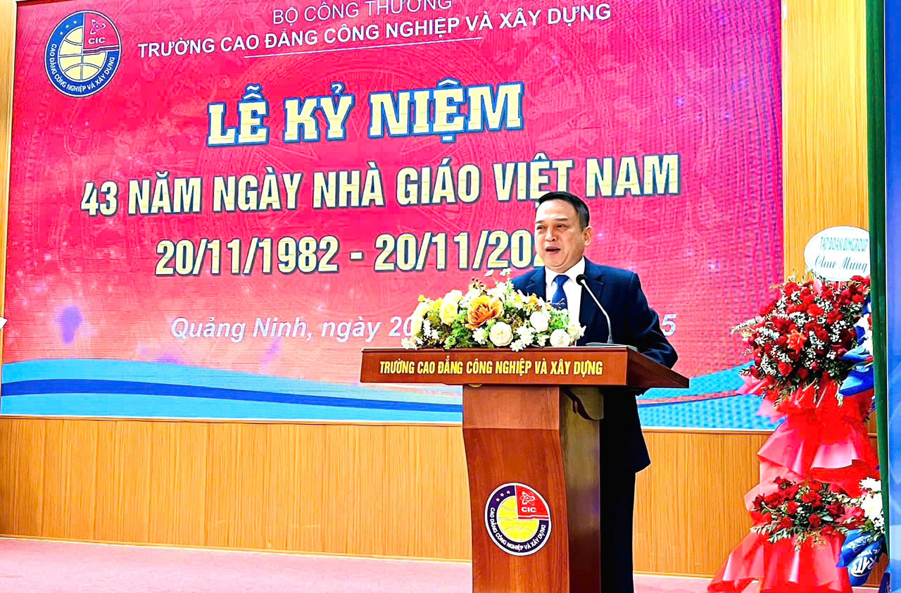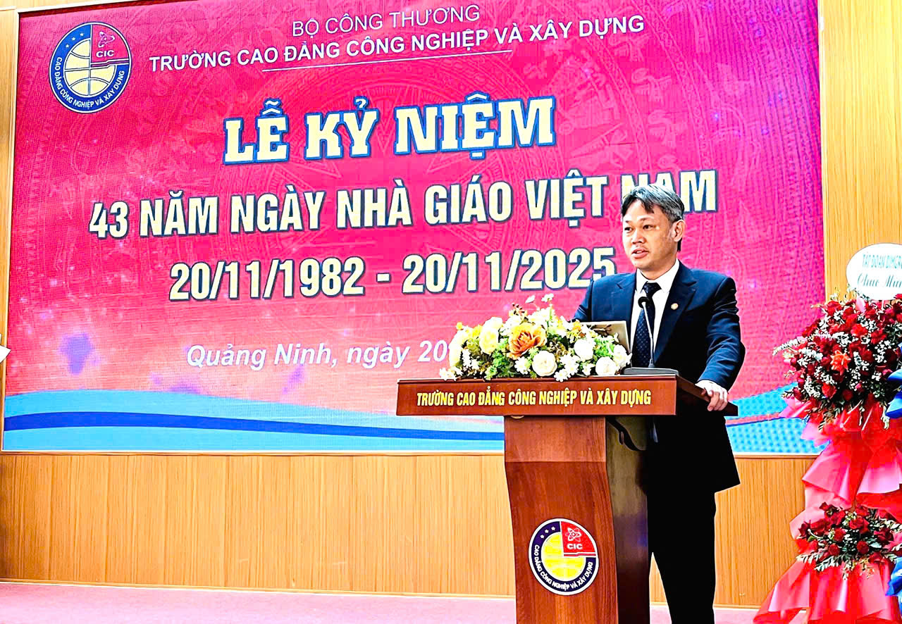 Chung vui với Nhà trường, đồng chí Nguyễn Trung Hải ghi nhận và biểu dương những kết quả nổi bật mà cán bộ, giảng viên Trường Cao đẳng Công nghiệp và Xây dựng đã đạt được trong thời gian qua. Đồng chí nhấn mạnh lòng yêu nghề và tinh thần cống hiến của đội ngũ nhà giáo là yếu tố quan trọng góp phần nâng cao chất lượng đào tạo, đáp ứng yêu cầu phát triển nguồn nhân lực cho địa phương. Đồng chí chúc các thầy, cô luôn mạnh khỏe, giữ vững ngọn lửa đam mê và tiếp tục đóng góp cho sự phát triển của Nhà trường, ngành giáo dục và tỉnh Quảng Ninh.