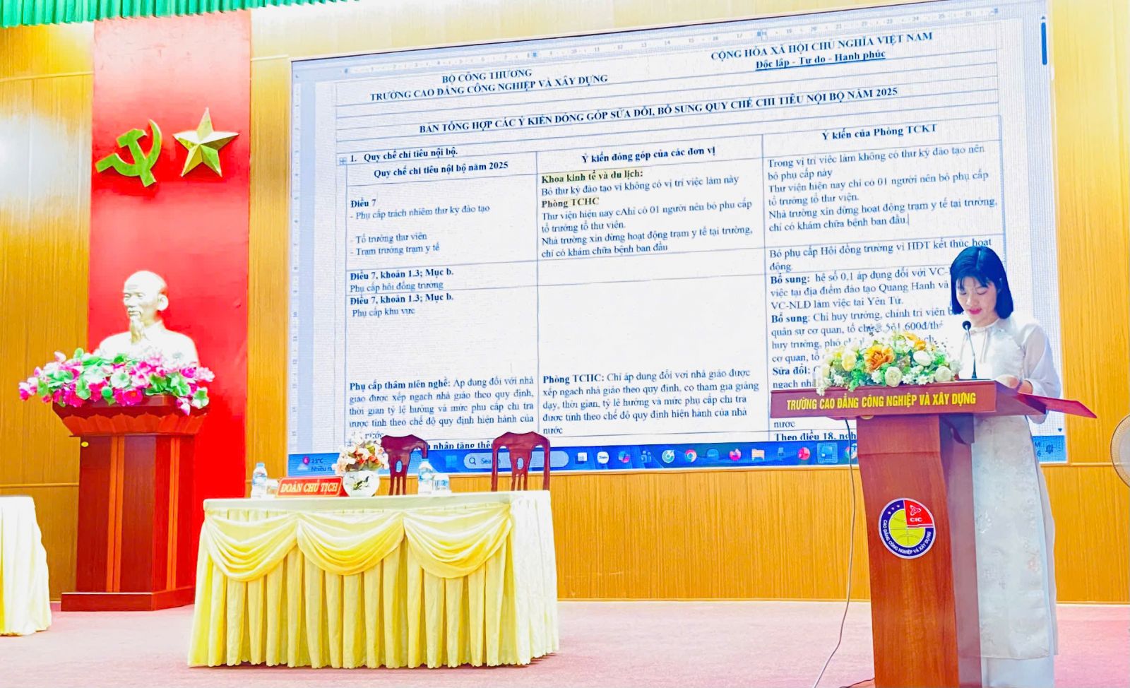 Đ/c Hoàng Thị Nguyên – Kế toán trưởng, Trưởng phòng TCKT báo cáo giải trình chỉnh sửa, bổ sung qui chế chi tiêu nội bộ của Nhà trường