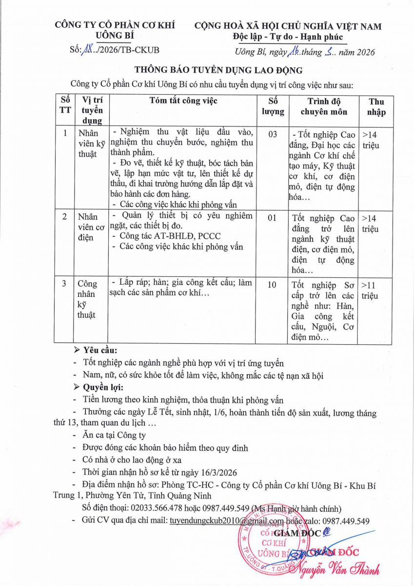 Thực hiện Kế hoạch sản xuất kinh doanh, Công ty Cổ phần Cơ khí Uông Bí (Đ/c: Bí Trung 1, phường Yên Tử, tỉnh Quảng Ninh) phối hợp với Trường Cao đẳng Công nghiệp và Xây dựng có nhu cầu tuyển dụng các vị trí cụ thể như sau: