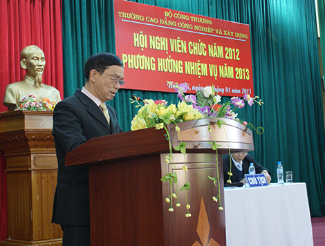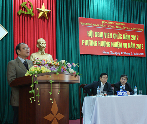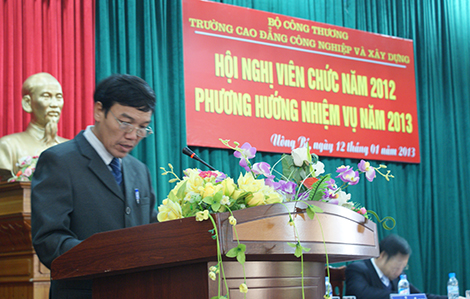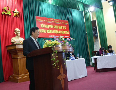 Thông qua bản Báo cáo tổng kết công tác năm 2012 và phương hướng nhiệm vụ năm 2013 do TS. Lương Văn Tiến – Hiệu trưởng nhà trường trình bày, đã chỉ rõ các mặt thuận lợi, khó khăn khi thực hiện các chỉ tiêu kế hoạch năm 2012; các kết quả thực hiện bao gồm công tác đào tạo, giáo dục; doanh thu đào tạo và sản xuất xây lắp; công tác tổ chức, lao động – tiền lương, thanh tra, bảo vệ, an toàn lao động; tình hình mua sắm, quản lý và sử dụng thiết bị vật tư; công tác quản lý tài chính; công tác đời sống; phong trào thi đua…
