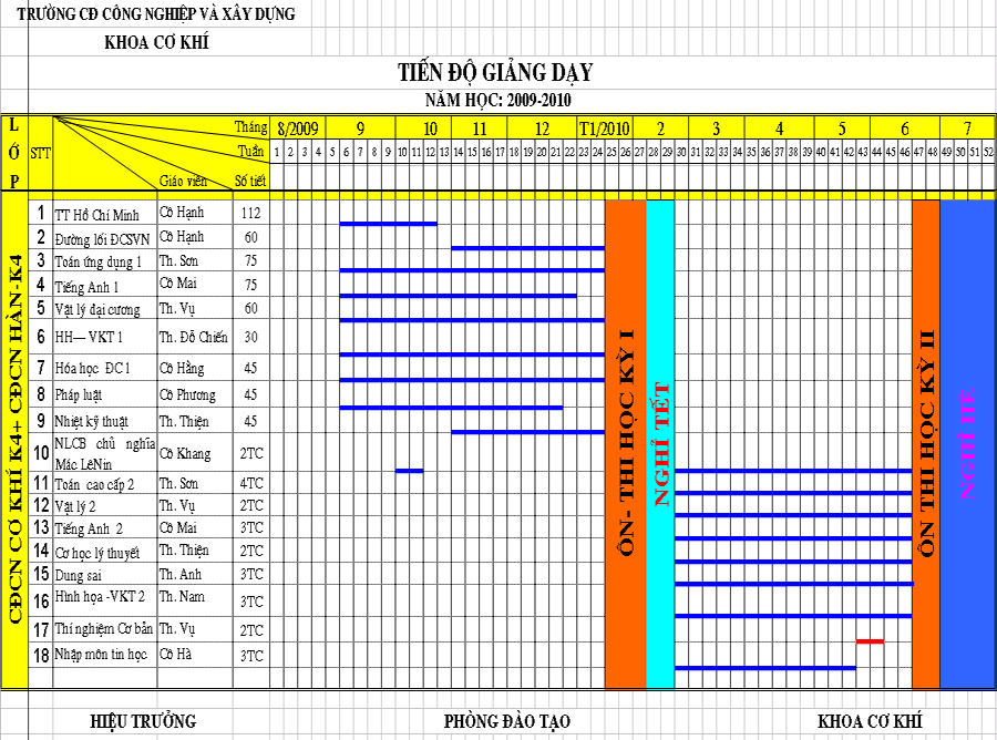 Kế hoạch đào tạo : Tiến độ giảng dạy năm học 2009 - 2010 Các lớp Cao đẳng khóa 4